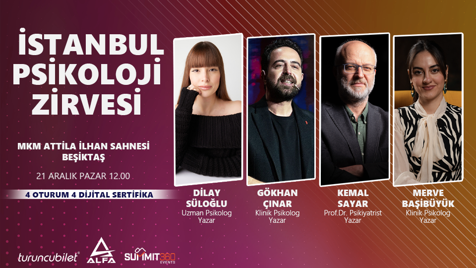 Türkiye'de birçok şehrinde salonları sonuna kadar dolduran, bilgi ve tecrübenin en üst düzeyde olduğu, farkındalıkları arttıran, kariyerinize yatırım yapmanızı sağlayan ve kendinizi geliştirmenize önemli bir adım olan PSİKOLOJİ ZİRVELERİ serisi Alfa Etkinlik ve Summit360 organizasyonunda 21 ARALIK 2025'te İSTANBUL'DA!